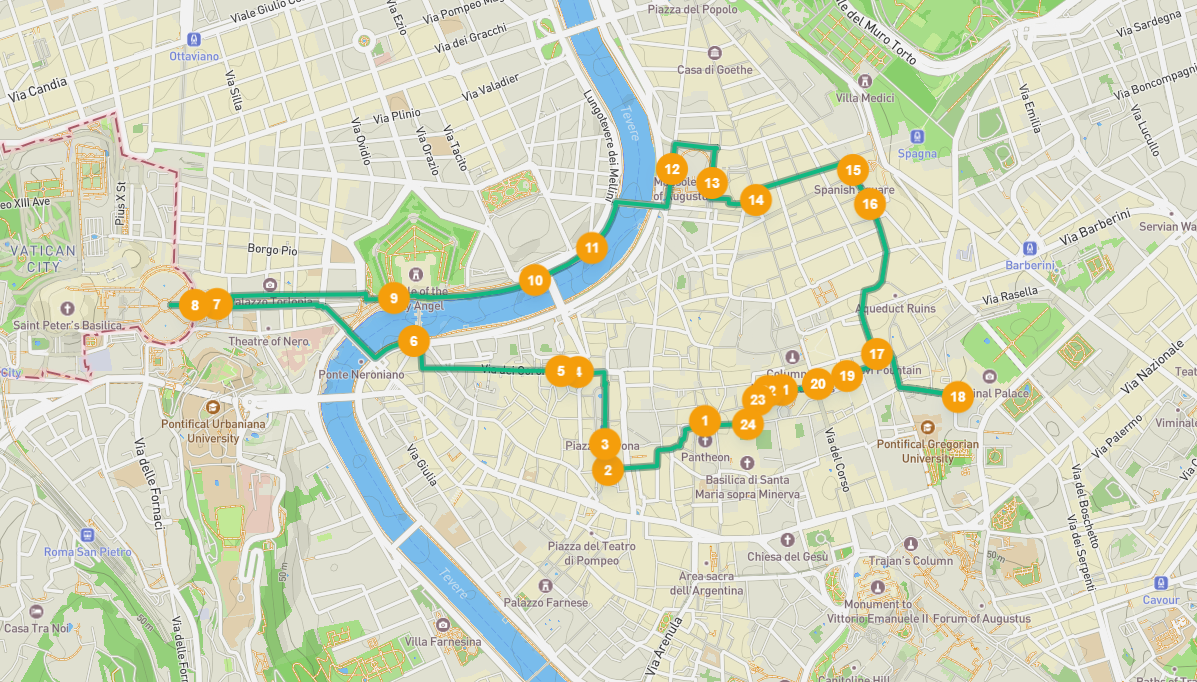Le centre de Rome, également appelé le cœur historique, est entièrement inscrit sur la liste du patrimoine mondial de l'UNESCO, ce qui montre immédiatement à quel point Rome est exceptionnellement belle. Découvrez les secrets de ce cœur historique au cours d'une intéressante visite audio guidée. Les rues étroites et les places pittoresques vous invitent à découvrir davantage la ville. Avec des sites impressionnants comme le Panthéon, la Place d'Espagne, la Fontaine de Trévi et le Palais du Quirinal, cette visite audio est idéale pour tous ceux qui veulent en savoir plus sur la Rome historique. Saviez-vous que Rome compte environ 280 fontaines et plus de 900 églises ? Découvrez de nombreux autres faits intéressants au cours de cette visite audio!