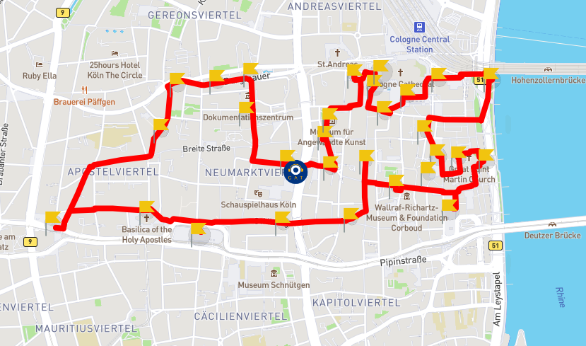 Discover the rich history and culture of Cologne with the captivating audiotour from CityAppTour. This unique tour takes you on an immersive walk along the iconic landmarks of the city, including the impressive Cologne Cathedral, Museum Ludwig, the charming Old Market, the Great St. Martin Church, the historic Hohenzollern Bridge, and the imposing Hahnentor. But that's not all - the tour also unveils the hidden gems and lesser-known spots that make Cologne so special. Learn fascinating stories and facts as you explore the city at your own pace. With the self-guided city tour featuring a personal audio guide, every step becomes a discovery, allowing you to experience Cologne like never before. Don't miss out on this exceptional experience and let yourself be enchanted by the charm and beauty of this wonderful city.