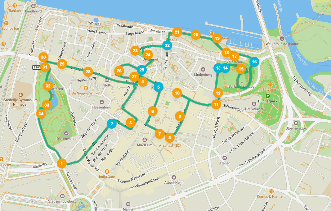Siete pronti a scoprire contemporaneamente il passato e il presente? Nimega è una delle città più antiche ed è ricca di resti dell’Impero romano, ma è anche diventata una città molto vivace (studentesca) con boutique alla moda. Inoltre, qui si percorre il maggior numero di chilometri ogni anno durante la Marcia dei Quattro Giorni di Nimega. Il modo migliore per conoscere questa affascinante città è tramite una visita audioguidata, in cui i luoghi più belli sono accuratamente selezionati per voi. Passerete davanti alla Waag, ammirerete la chiesa di Sint Stevens e vagherete per il Kronenburgerpark alla ricerca della speciale Kruittoren. Tornerete a scuola alla Scuola Latina? O preferite andare alla ricerca della misteriosa storia di Moenen? Scoprite la città durante questa visita audioguidata.