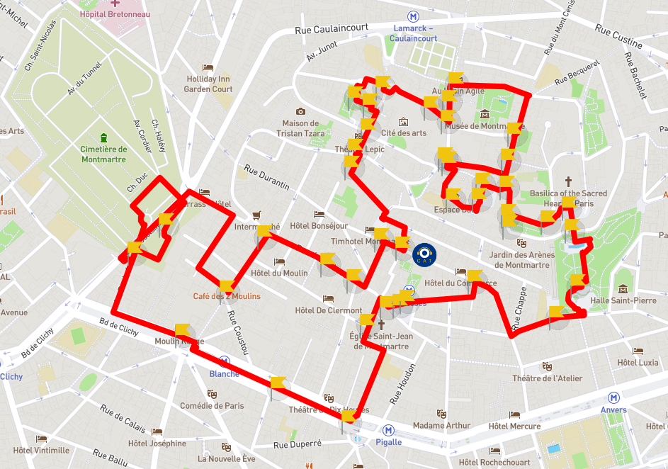 Montmartre, ook wel de kunstenaarswijk van Parijs genoemd, was voorheen een dorpje buiten Parijs maar is sinds 1860 als wijk toegevoegd aan de stad. Tijdens de zelfgeleide audiotour door de stad zul je wel zien dat Montmartre haar dorpse karakter heeft weten te behouden. Zo loop je namelijk langs pittoreske pleintjes, spot je de witgekalkte huisjes en struin je door smalle, maar gezellige straatjes. Bovendien kom je met deze stadswandeling ook langs indrukwekkende plekken zoals het bekende Moulin Rouge, het schilderspleintje Place du Tertre, de Sacré-Coeur en Statue Saint-Denis. Ook waan jij je weer even in de film ‘Le Fabuleux Destin d’Amélie Poulain’ bij het groentewinkeltje en wie weet word jij wel verliefd bij de liefdesmuur met ‘ik hou van je’ geschreven in maar liefst 250 talen.
