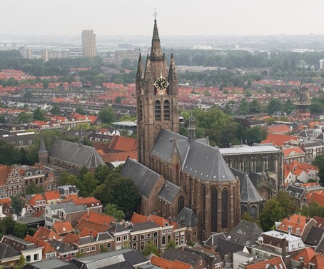 Bouwmeesters begonnen in 1246 zonder te beseffen dat ze bouwden op onstabiel veengrond. Vermeer ligt hier begraven, samen met wetenschapper Antonie van Leeuwenhoek die bacteriën ontdekte. De scheeve toren werd Delft's meest gefotografeerde herkenningspunt.