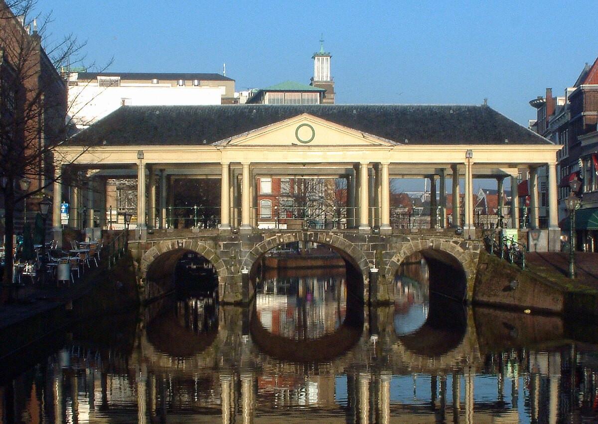 De stenen boogbrug uit 1642 was eeuwenlang het centrum van de graanhandel. Het stadswapen met sleutels is omlijst door korenaren. Een stadswandeling Leiden móét hier langs: de neoclassicistische kappen beschermden de koopwaar tegen regen. Aan de vismarktzijde prijst de lakenkoopman zijn stof aan in brons.