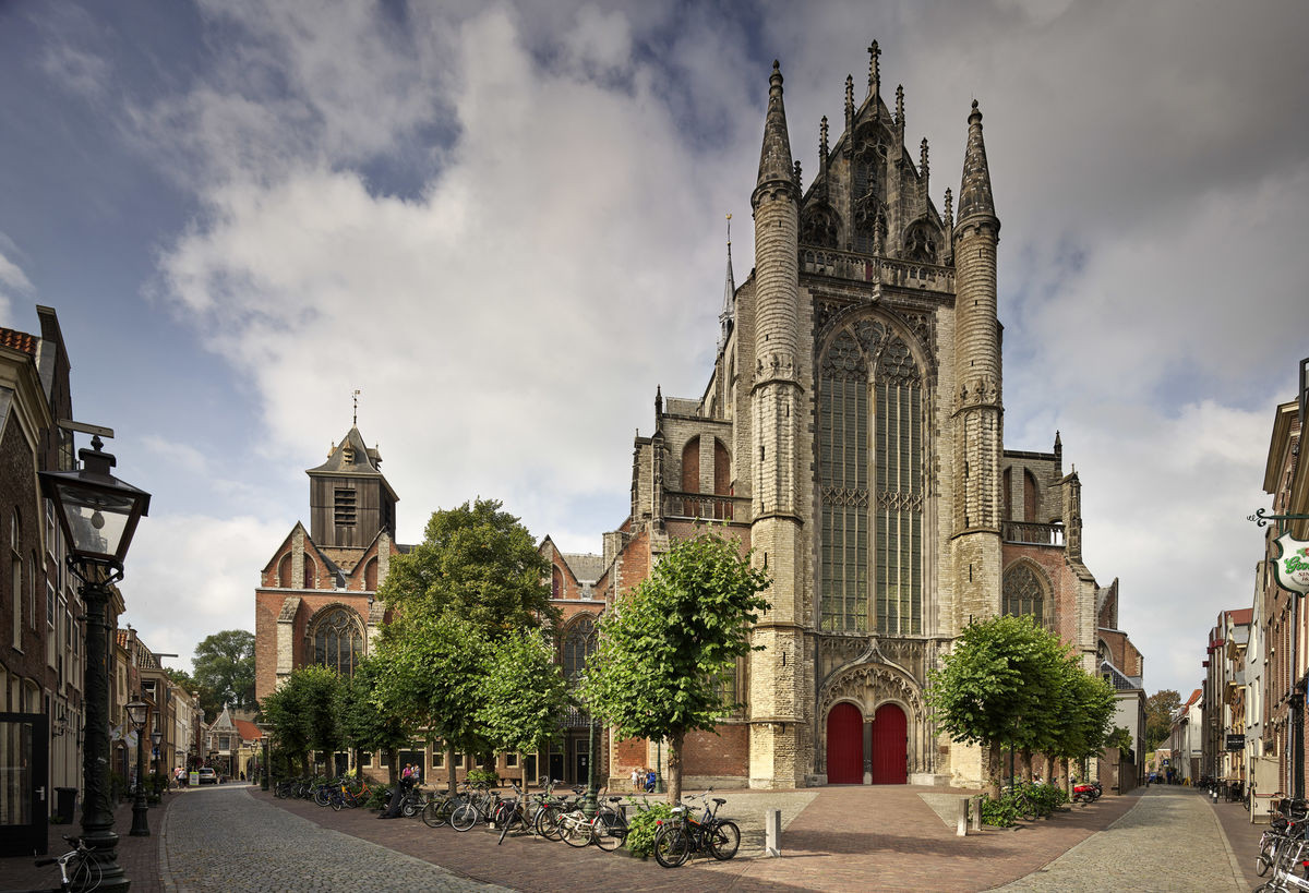 Wat je hier ziet: De kerk zonder toren – de 110 meter hoge toren stortte in 1512 in en werd nooit herbouwd. Hier ging de jonge Rembrandt naar de Latijnse school.