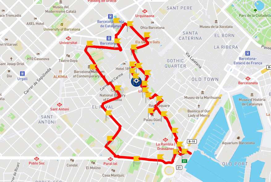 Rambla en El Raval, twee fascinerende wijken in Barcelona, vormen het decor voor een rijke culturele ontdekkingsreis met de CityAppTour audiotour. Deze zelfgeleide stadswandeling met audiogids leidt je langs de Mercat de la Boqueria, betovert met kleurrijke kraampjes vol verse producten en lokale lekkernijen en langs Font de Canaletes, waar de legende begint dat wie van dit fonteinwater drinkt, terugkeert naar Barcelona. Verken tijdens deze wandelroute ook het Maritiem Museum en duik in de maritieme geschiedenis van de stad. Dwaal door de bruisende La Rambla, waar straatartiesten en kraampjes de sfeer bepalen en laat je ook nog even onderdompelen in het culturele erfgoed dat Palau de la Virreina te bieden heeft.