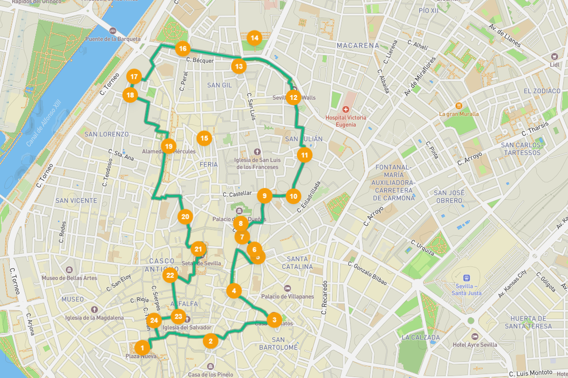 Sevilla is de hoofdstad van Andalusië en wordt gezien als een van de mooiste steden in Spanje. Deze stad is rijk aan geschiedenis door invloeden van de Moren uit de achtste eeuw, door vele katholieke kathedralen en kerken en vanwege het feit dat Sevilla lange tijd de thuisbasis van de Spaanse zilvervloot was. De mooiste bezienswaardigheden zijn zorgvuldig voor jou op een rijtje gezet tijdens deze audiotour. Zo ontdek je in het noorden van Sevilla de Ayuntamiento de Sevilla, Metropol Parasol, Casa de Pilatos en Iglesia Colegial del Divino Salvador. Bovendien loop je langs de oudste bar van Sevilla en wie weet kom jij wel achter het traditionele recept in een van de meest representatieve en toegankelijkste kloosters van de stad. Ga jij op pad om de Andalusische sfeer te voelen?