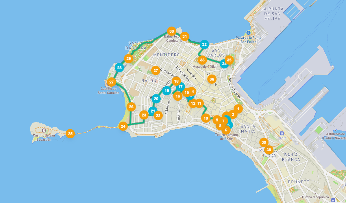 Cádiz, located on a peninsula on the Atlantic Ocean and the oldest city in Spain. This city is, because of its shape with sea on three sides, also called Una Taza de Plata, which means the silver bowl. Another nickname for the city is Little Havana, because of the similarities and ties between the two cities. During this audio tour you will get to know impressive sights such as the Cathedral of Cádiz, Torre Tavira, Castillo de San Sebastián, Teatro Romano de Cádiz and Parque Genovés. So enough to be amazed by this beautiful city during this walking tour. Moreover, you walk along beautiful squares and you can enjoy all the greenery around you. Are you ready to discover Cádiz?